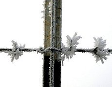 Within that stretch, for a day or two, we had some frosts that were spectacular. Frosts like none I'd seen before. I was out taking photos of the vegetation near the creek and then decided to drive a bit up the road to see what the frost was like in some of the swales. There I started seeing the fencing coated in fuzzy spines. |